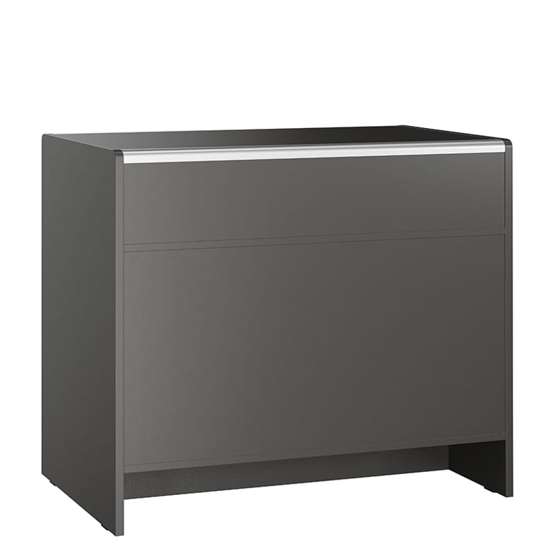 LP4 120 cm jaemüügilett - Elegantne lett rõivakauplustele. See rõivakaupluse lett on minimalistliku disainiga. See on valmistatud 18 mm paksusest lamineeritud plaadist, mis tagab vastupidavuse. Töötasapind on varustatud hõbedaste alumiiniumprofiilidega. Need asuvad kapi esi- ja tagaküljel, kaitstes tööpinda kahjustuste eest. Jaemüügiküljel on järgmised riiulid: - ülemine riiul 116 x 48 cm - keskmine riiul 116 x 44 cm - alumine riiul 116 x 50 cm